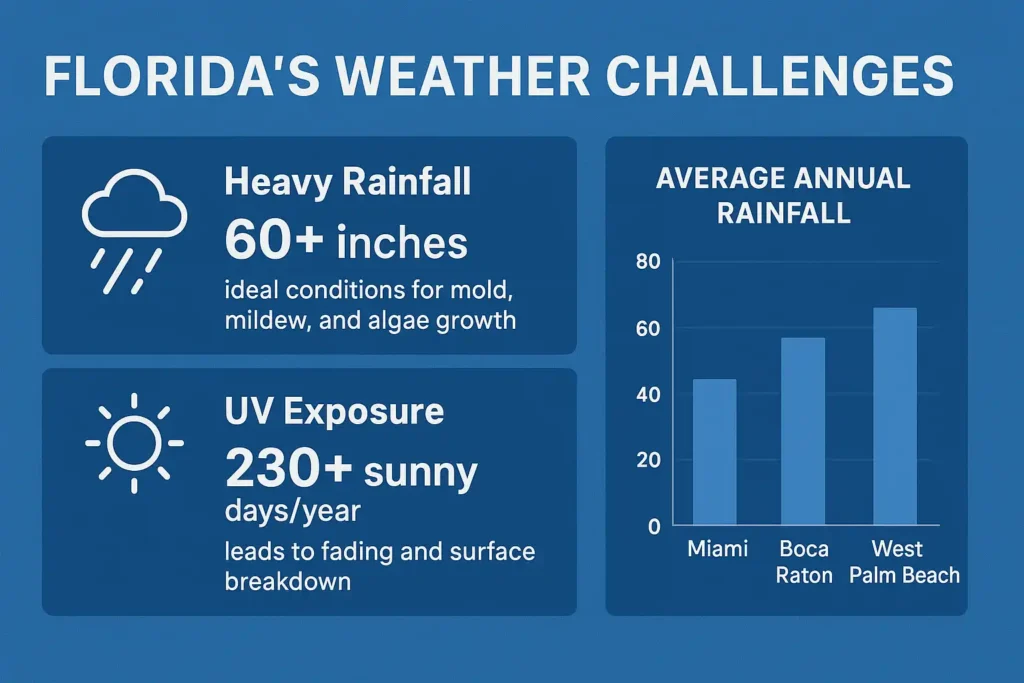 In Florida, sealing pavers isn’t just about aesthetics—it’s about protection. With an average of over 50 inches of annual rainfall, humidity levels that often exceed 74%, and intense UV exposure nearly year-round, Florida’s climate can be harsh on unsealed surfaces. Left untreated, pavers can fade, shift, crack, or develop mold and algae within just a few seasons.